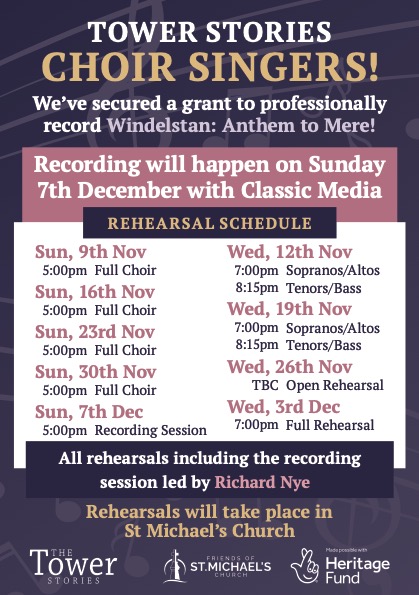 Tower Stories have secured a grant to professionally record Windelstan: Anthem for Mere. A specialist recording company Classic Media will be coming on Sunday the 7th December to do this. We want as many of the original choir as possible to be involved in this and will be holding rehearsals during November and early December … Read more